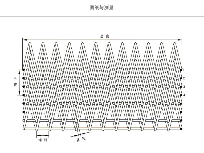 人字網帶是由左右交替的網條通過四根直串條連接而成,此網帶可擋住較小物件的滲漏,組合牢固,抗拉強度大,廣泛應用于石油化纖、熱處理、食品工業等行業,邊緣可加擋片,直接焊接或直接翻邊。