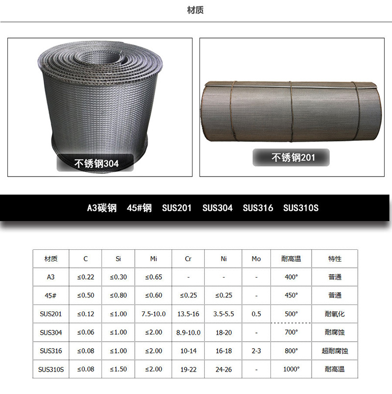 材質有普通鍍鋅絲、不銹鋼201、不銹鋼304、不銹鋼314、不銹鋼310S。